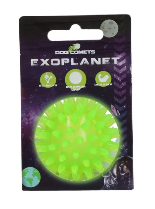 Deze bal vol met stevige maar flexibele 'stekels' zorgt voor urenlang speelplezier en helpt tegelijkertijd het gebit te reinigen! De Dog Comets Exoplanet stuitert perfect, drijft op water en is dankzij de stekels makkelijk vast te pakken. Deze eigenschappen zorgen ervoor dat de bal erg geschikt is voor het apporteren en om mee te spelen in het water. Als de hond de bal in de bek vastpakt, dan masseren de stekels het tandvlees en ze helpen de tanden te reinigen. De pieper in het midden zorgt voor extra stimulans tijdens het spelen.