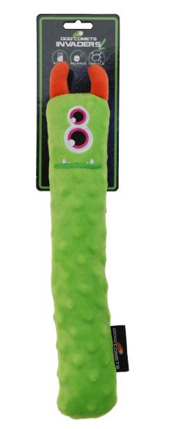Deze buitenaardse wezens nemen samen met de trouwste viervoeters de wereld over! Deze knuffelige werpstokken zijn gevuld met een sponsvulling, wat ze zwaarder en dichter maakt dan standaard hondenspeeltjes. Het knisperende materiaal aan de binnenzijde en de pieper zorgen voor extra stimulans tijdens het spelen en moedigen de hond aan om zijn tanden in het speeltje te zetten. De Invaders zijn perfect om binnen mee te spelen, lekker mee te knuffelen en trek- en apporteerspelletjes te doen. Elke Invader heeft een unieke gezichtsuitdrukking en persoonlijkheid.