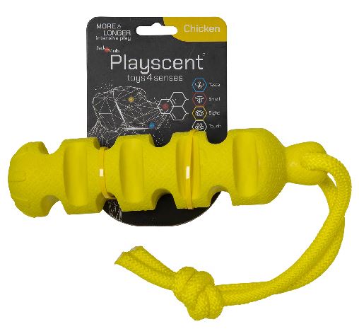 - Verrijkt met Kip Smaak: De Playscent Dummy is doordrenkt met een kip aroma, wat het extra aantrekkelijk maakt voor uw hond en hun zintuigen prikkelt tijdens het spelen.