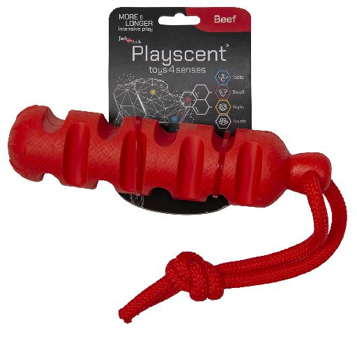 - Verrijkt met Rund Smaak: De Playscent Dummy is doordrenkt met een rund aroma, wat het extra aantrekkelijk maakt voor uw hond en hun zintuigen prikkelt tijdens het spelen.