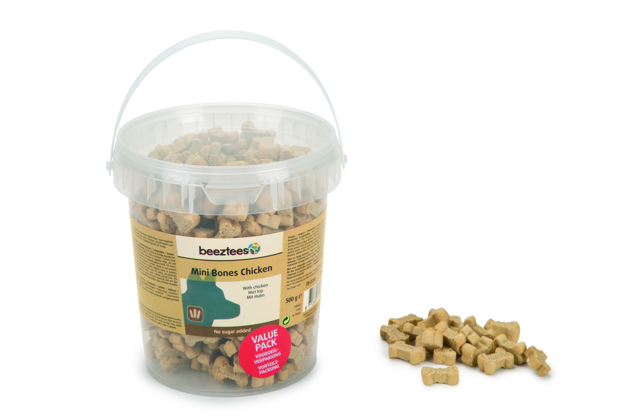 Beeztees Mini Bones Chicken Mix is een onweerstaanbare snack voor uw hond als tussendoortje. Jouw hond zal deze semi-moist snack met kip heerlijk vinden. Door het kleine formaat van de snack is deze zeer geschikt als beloning tijdens trainingen met jouw hond. Deze snack bevat geen toegevoegde suikers. Handig detail: het is een hersluitbaar emmertje. - Ideale trainingssnack - Zonder toegevoegde suikers - Handig hersluitbaar emmertje