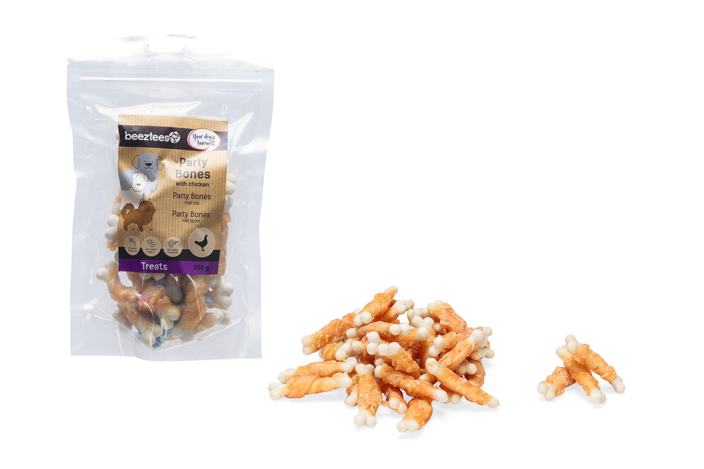 Beloon jouw hond met deze Beeztees hondensnack party bones met kip. Het staafje van deze snack bestaat uit een mix van rund en rijst. Om de snack nog lekkerder te maken voor jouw hond zijn de uiteinden voorzien van kip. Aan deze snacks zijn geen kleur-, smaakstoffen en suikers toegevoegd. Al met al zal jouw hond dol zijn op deze Beeztees hondensnack. Deze snacks zijn onderdeel van de Beeztees Tasty Treats: een assortiment van zachte en krokante hondensnacks, perfect als beloning, tussendoortje of gewoon omdat jouw hond het verdient.