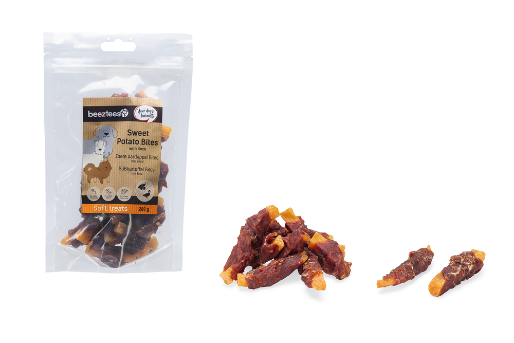 Beloon jouw hond met deze heerlijke Beeztees hondensnack zoete aardappel bites met eend. Deze smakelijke bites combineren de zachte structuur van zoete aardappel met een smaakvol laagje eend, hierdoor zijn ze onweerstaanbaar voor elke hond! Aan deze snacks zijn geen kleur-, smaakstoffen en suikers toegevoegd. De zachte textuur maakt deze snack bovendien makkelijk te kauwen, ook voor oudere honden of honden met een gevoeliger gebit. Al met al zal jouw hond dol zijn op deze Beeztees hondensnack. Deze snacks zijn onderdeel van de nieuwe Beeztees Tasty Treats: een assortiment van zachte en krokante hondensnacks, perfect als beloning, tussendoortje of gewoon omdat jouw hond het verdient.