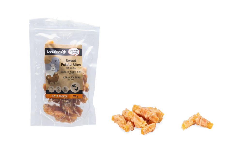 Beloon jouw hond met deze heerlijke Beeztees hondensnack zoete aardappel bites met kip. Deze smakelijke bites combineren de zachte structuur van zoete aardappel met een smaakvol laagje kip, hierdoor zijn ze onweerstaanbaar voor elke hond! Aan deze snacks zijn geen kleur-, smaakstoffen en suikers toegevoegd. De zachte textuur maakt deze snack bovendien makkelijk te kauwen, ook voor oudere honden of honden met een gevoeliger gebit. Al met al zal jouw hond dol zijn op deze Beeztees hondensnack. Deze snacks zijn onderdeel van de nieuwe Beeztees Tasty Treats: een assortiment van zachte en krokante hondensnacks, perfect als beloning, tussendoortje of gewoon omdat jouw hond het verdient.