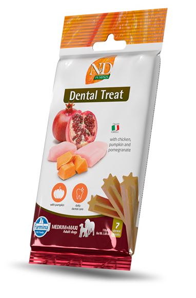 Dental Treat Kip, Pompoen & Granaatappel is aanvullende voeding voor honden ouder dan 4 maanden, om tandplak en tandsteen te verwijderen en te voorkomen. De dental treats zijn graanvrij, bevatten veel dierlijke ingrediënten en bevatten prebiotica om de spijsvertering te ondersteunen.