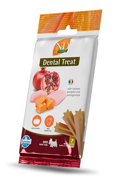 Dental Treat Kip, Pompoen & Granaatappel is aanvullende voeding voor honden ouder dan 4 maanden, om tandplak en tandsteen te verwijderen en te voorkomen. De dental treats zijn graanvrij, bevatten veel dierlijke ingrediënten en bevatten prebiotica om de spijsvertering te ondersteunen.
