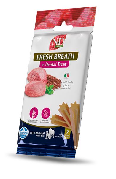 Dental Treat Fresh Breath is aanvullende voeding voor honden ouder dan 4 maanden, om tandplak en tandsteen te verwijderen en te voorkomen. De dental treats zijn specifiek geschikt om een frisse adem te bevorderen. De dental treats zijn graanvrij en bevatten mint, wat een frisse adem bevordert.