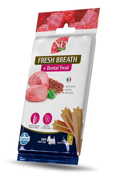 Dental Treat Fresh Breath is aanvullende voeding voor honden ouder dan 4 maanden, om tandplak en tandsteen te verwijderen en te voorkomen. De dental treats zijn specifiek geschikt om een frisse adem te bevorderen. De dental treats zijn graanvrij en bevatten mint, wat een frisse adem bevordert.