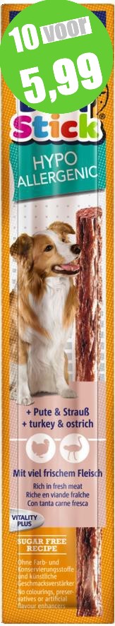 De Vitakraft Beef Stick overtuigt hond en baasje door topkwaliteit, een heerlijke geur en een zeer hoog vleesgehalte en dat alles met een unieke smaak. Ideaal om te verwennen, te belonen en voor de kleine trek tussendoor! Hypoallergene Beef Stick met geselecteerde eiwit- en koolhydraatbronnen van kalkoen, struisvogel, rijst en aardappelen. Perfect voor honden met een specifieke intolerantie of allergieën.
