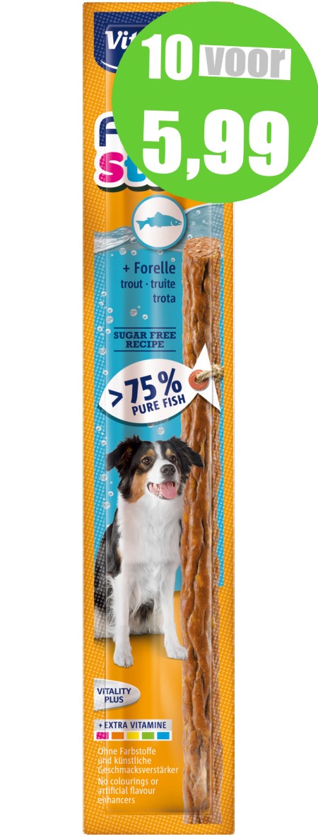 Vitakraft Fish Stick met forel bevat meer dan 75% pure vis en is daardoor ideaal voor honden met voedselovergevoeligheden. De natuurlijke omega 6 vetzuren ondersteunen een gezonde huid en een mooie vacht. De vis wordt verkregen uit duurzame viskwekerij. Ideaal om te verwennen, te belonen en voor de kleine trek tussendoor!