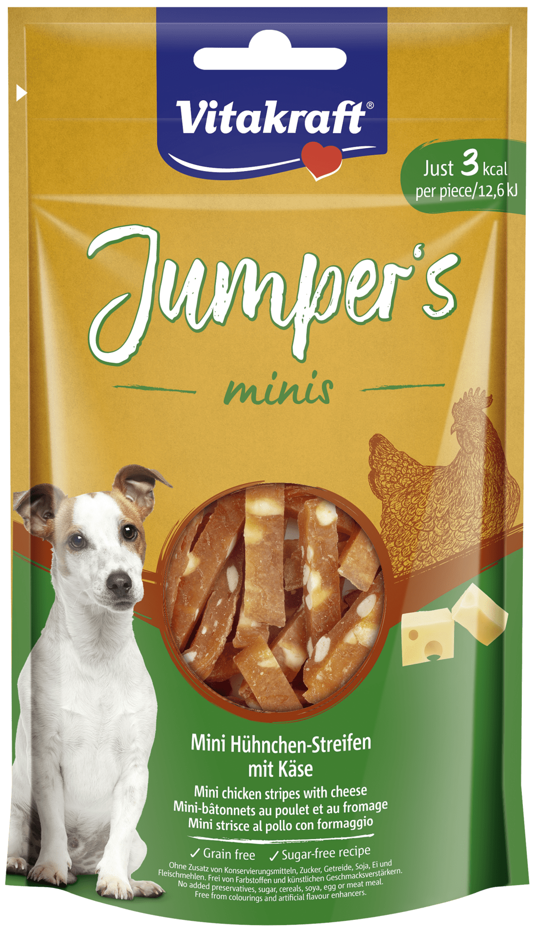 Of het nu gaat om een liefdevol tussendoortje of om een lekkere motivatie voor tijdens het trainen: deze variant van de Jumper’s minis is altijd een grote verrassing voor de hond. Want de trainingssnack van mager kippenvlees zijn gepeperd met stevige kaas! Bovendien overtuigen de kleine lekkernijen met hun volle smaak – met slechts 3 kcal per stuk. Kortom, de ultieme beloning voor je soulmate!