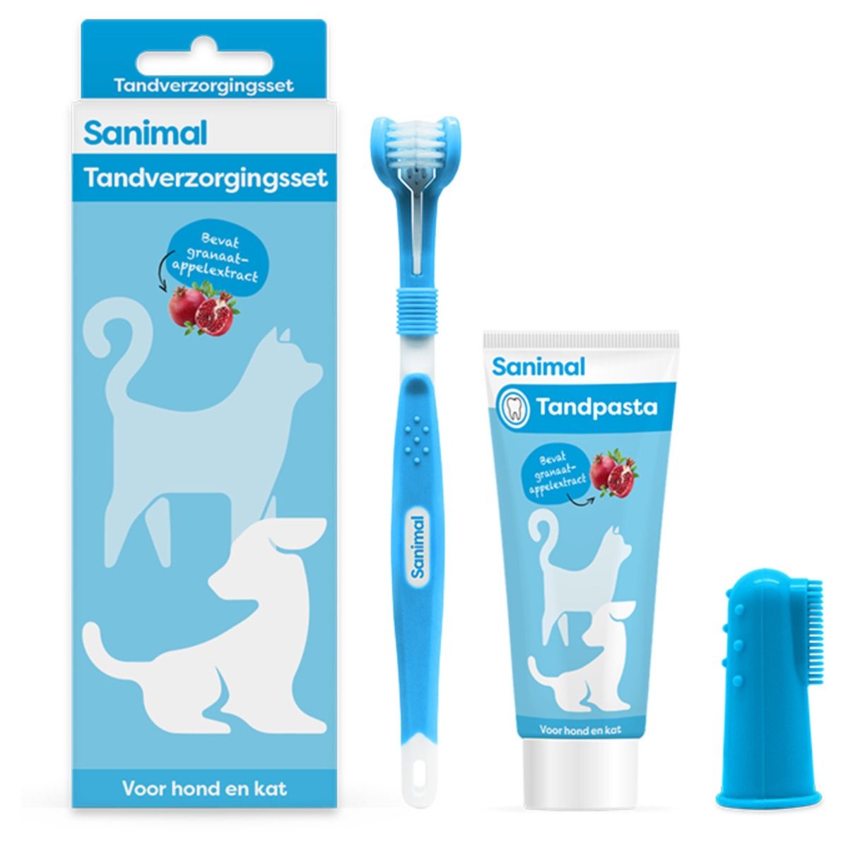 Sanimal Tandverzorgingsset is een 3-delige set om het gebit van honden & katten te reinigen. De set bestaat uit:
