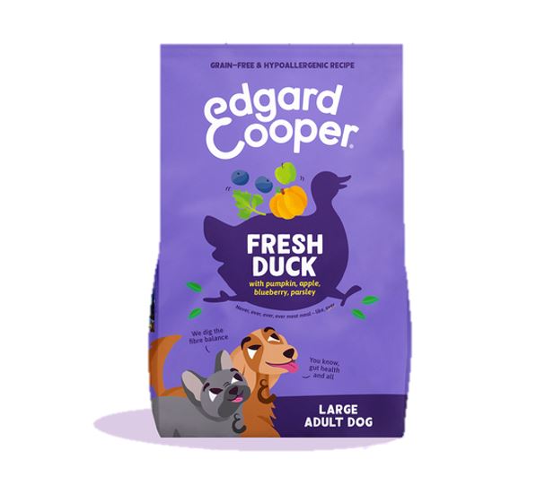 Edgard & Cooper Hondenvoer Droog Adult Medium Eend is bereid met uitsluitend verse eend en bevatten geen vleesmeel. Zo krijgt jouw hond eiwitten van topkwaliteit die bijdragen aan sterke spieren en een goede conditie. Het recept is volledig graanvrij en de brokjes hebben een ideaal formaat voor middelgrote honden. De vezelbalans is afgestemd op de spijsvertering van volwassen honden. Natuurlijke ingrediënten zoals pompoen en appel leveren waardevolle voedingsstoffen en zorgen bovendien voor een heerlijke smaak. Een pure, smakelijke maaltijd waar jouw hond elke dag van geniet.