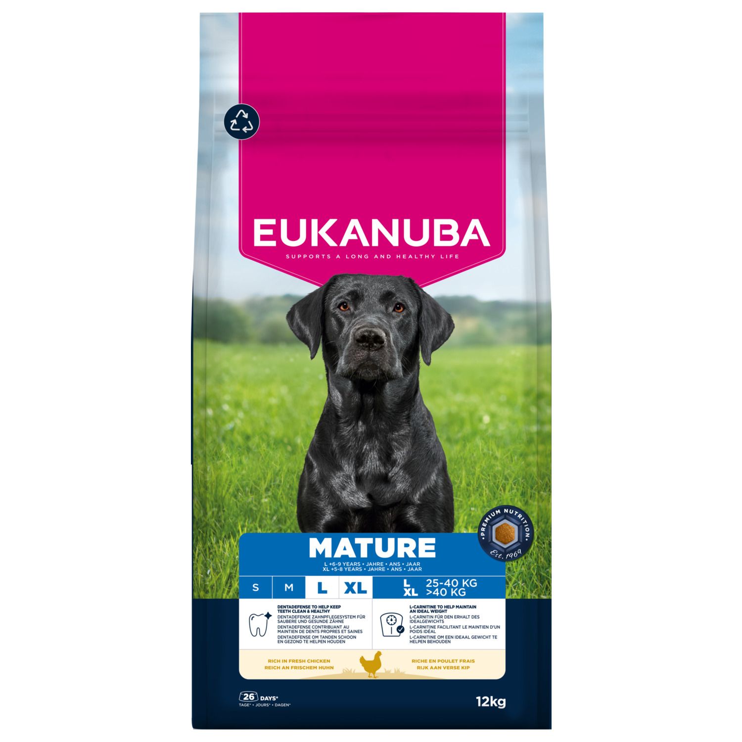 EUKANUBA Life Care biedt wetenschappelijk onderbouwde hoogwaardige voeding om te voldoen aan de veranderende behoeften van honden in elke levensfase. Dit droogvoer, samengesteld met verse kip, is speciaal ontwikkeld voor grote, oudere honden van 6 tot 9 jaar (5 tot 8 jaar voor zeer grote honden). De geselecteerde ingrediënten bieden voeding op maat om gezond ouder te worden en de algehele vitaliteit te ondersteunen. L-Carnitine helpt bij de vetverbranding, waardoor uw hond een optimaal gewicht kan behouden en de gewrichten minder worden belast. De aangepaste vezelmix van prebiotisch FOS en bietenpulp zorgt voor een gezonde spijsvertering, terwijl glucosamine en chondroïtine de gezondheid van de gewrichten ondersteunt en calcium voor sterke botten zorgt. Natuurlijke bronnen van omega-6- en omega-3-vetzuren bevorderen een gezonde huid en een glanzende vacht, terwijl een antioxidantenmix met vitamine E het immuunsysteem van uw hond helpt versterken. Verder helpen de unieke zeshoekige brokjes van EUKANUBA, in combinatie met het DentaDefense tandverzorgingssysteem, om op lange termijn een schoon en gezond gebit te behouden. Deze 100% complete en uitgebalanceerde voeding levert geavanceerde voeding ter ondersteuning van een optimale lichaamsconditie en levenslang welzijn voor grote, oudere honden. Vertrouw op EUKANUBA voor voeding van hoge kwaliteit, aangepast aan elke levensfase van uw hond.