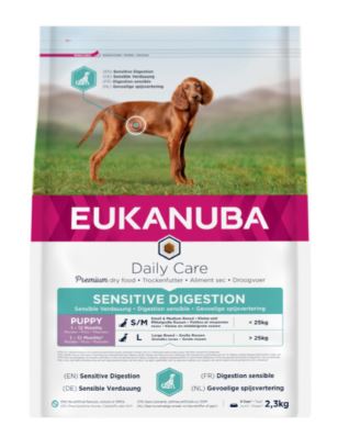 Het Eukanuba Daily Care droogvoer met verse kip voor puppy's met een gevoelige spijsvertering is speciaal gemaakt voor honden met een gevoelige maag. Met licht verteerbare rijst biedt dit dieet een alternatief voor puppy's met speciale voedingsbehoeften. Dit recept ondersteunt het natuurlijke evenwicht van de darmmicroflora en helpt de opname van voedingsstoffen te optimaliseren. Daarnaast helpen de prebiotica FOS & MOS evenals butyraat en bietenpulp een gezonde spijsvertering te ondersteunen. Voor een gezonde huid en vacht zijn natuurlijke bronnen van omega 6 & 3 in deze voeding opgenomen, terwijl het aanwezige calcium sterke botten ondersteunt. Een ander belangrijk onderdeel van dit voer is DHA. Vooral in de eerste levensfase draagt dit meervoudig onverzadigde vetzuur bij aan de gezonde ontwikkeling van honden, ondersteunt de trainbaarheid en helpt bij het leren. Eukanuba Daily Care droog hondenvoer voor puppy's met een gevoelige spijsvertering is 100% compleet en uitgebalanceerd ontwikkeld om te voldoen aan de behoeften van honden met speciale voedingsbehoeften.