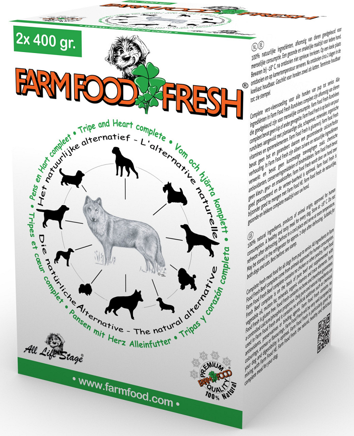 Complete vers-vleesvoeding voor alle honden van pup tot senior. Alle ingrediënten in Farm Food Fresh zijn afkomstig van dieren die goedgekeurd zijn voor menselijke consumptie. Farm Food Fresh bevat geen kip of ander gevogelte. Farm Food Fresh is op basis van puur rundvlees aangevuld met plantaardige olie, schapenvet, mineralen, organische vitamines en sporenelementen. Farm Food Fresh is glutenvrij. Farm Food Fresh bevat geen bot en garandeert daarom een gecontroleerde calcium/fosfor verhouding. In Farm Food Fresh zijn alleen zuivere en natuurlijke ingrediënten verwerkt en bevat geen kunstmatige toevoegingen zoals: chemische antioxidanten, conserveringsmiddelen of bindmiddelen. Farm Food Fresh bevat geen kleur-, geur- en smaakstoffen. Farm Food Fresh wordt door uw hond zeer goed geaccepteerd en de verteerbaarheid is optimaal. Farm Food Fresh is bijzonder goed te mengen met Farm Food HE. Farm Food Fresh: de natuurlijke, gezonde en lekkere complete maaltijd voor uw hond.
