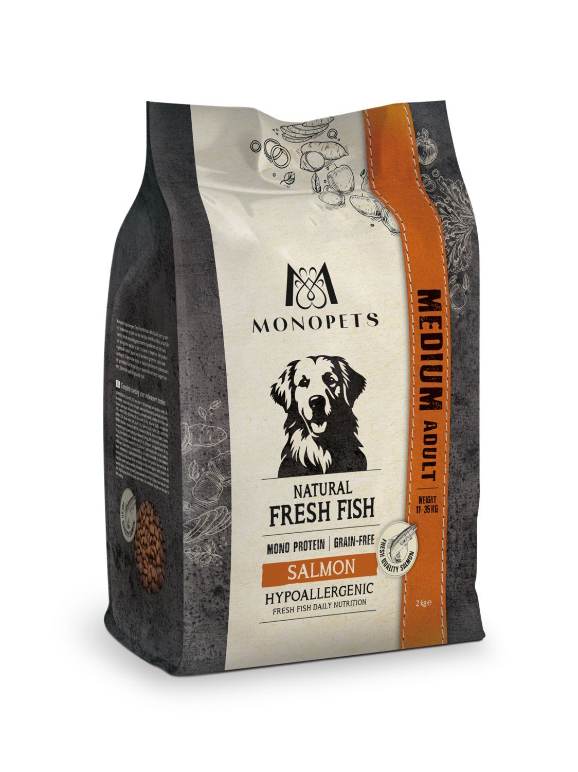 Monopets hypoallergeen Fresh Fish Medium Adult Zalm is een smaakvol graanvrij hondenvoer op basis van één dierlijke eiwitbron. Deze natuurlijke voeding bevat zorgvuldig geselecteerde ingrediënten om het risico van allergische reacties tot een minimum te beperken. Het product is gemaakt zonder granen en zit boordevol groenten en fruit, zoals zoete aardappel en appel. Waardevolle vezels uit prebiotica en natuurlijke bronnen ondersteunen de gezondheid van de darmen, en essentiële vetzuren zorgen voor een glanzende vacht en gezonde huid.
