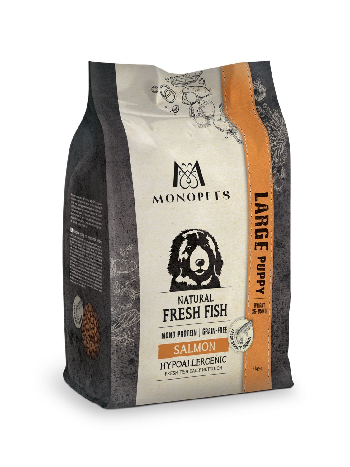 Monopets hypoallergeen Fresh Fish Large Puppy Zalm is een smaakvol graanvrij hondenvoer op basis van één dierlijke eiwitbron. Deze natuurlijke voeding bevat zorgvuldig geselecteerde ingrediënten om het risico van allergische reacties tot een minimum te beperken.