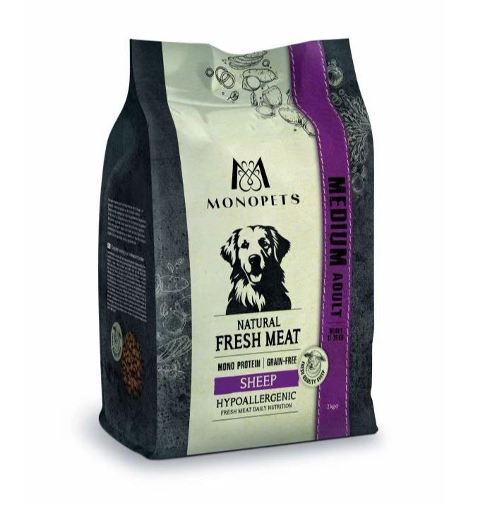 Monopets hypoallergeen Fresh Meat Medium Adult Schaap is een smaakvol graanvrij hondenvoer op basis van één dierlijke eiwitbron. Deze natuurlijke voeding bevat zorgvuldig geselecteerde ingrediënten om het risico van allergische reacties tot een minimum te beperken. Het product is gemaakt zonder granen en zit boordevol groenten en fruit, zoals zoete aardappel en appel. Waardevolle vezels uit prebiotica en natuurlijke bronnen ondersteunen de gezondheid van de darmen, en essentiële vetzuren zorgen voor een glanzende vacht en gezonde huid.