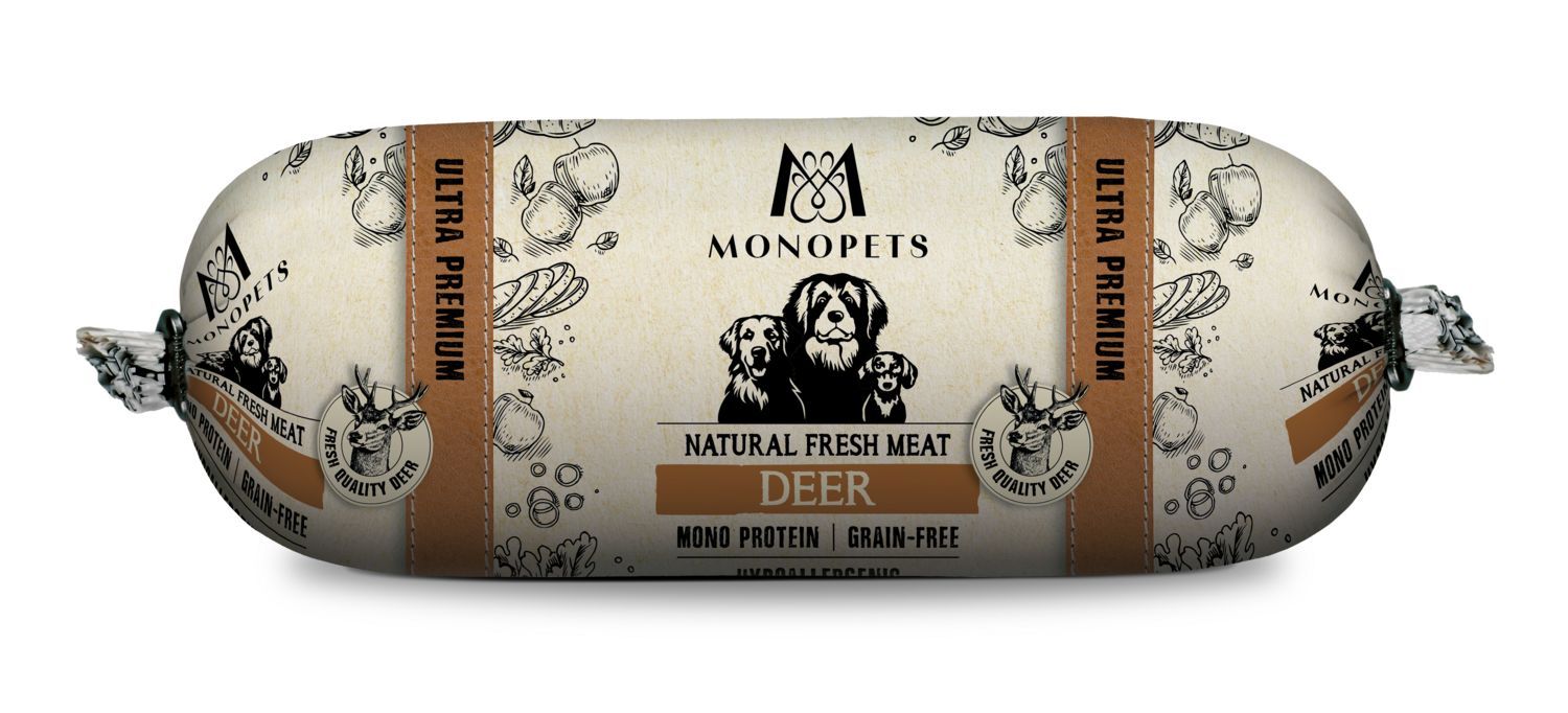 Hypoallergeen graanvrij hondenworst met vers hert voor alle volwassen hondenrassen.