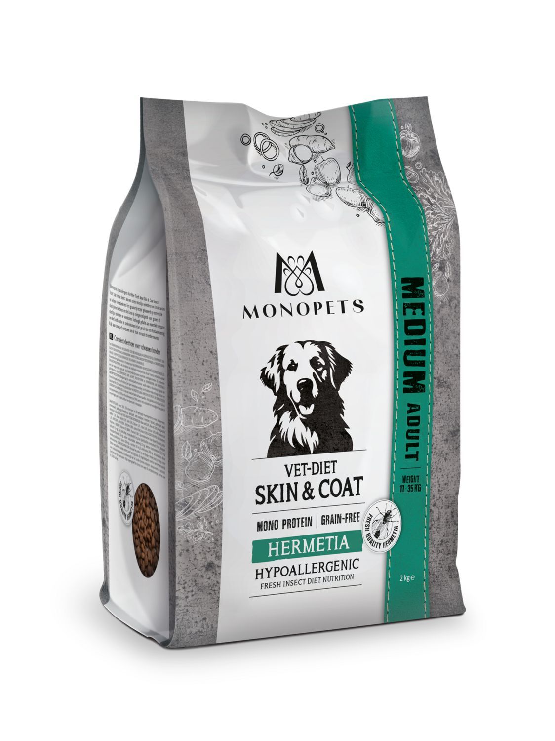 Monopets hypoallergeen Medium Vet-Diet Fresh Meat Skin & Coat Insect: Inzet van verse insect als een unieke dierlijke eiwitbron om intoleranties te helpen verminderen. Een graanvrij recept gebaseerd op een enkele dierlijke eiwitbron om de kans op overgevoeligheid voor granen of dierlijke eiwitten te voorkomen. Verhoogd gehalte aan essentiële vetzuren om de huidfunctie te ondersteunen in het geval van een huidaandoening. Rijk aan omega-3-vetzuren om de huid en vacht te ondersteunen.