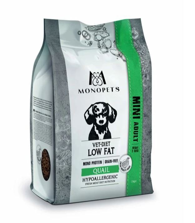 Monopets hypoallergenic Mini Vet-Diet Low Fat Kwartel: Dieetvoeder ter vermindering van overgewicht. Dankzij een combinatie van een laag vetgehalte, verhoogd gehalte aan vezels en inzet van L-carnitine wordt het nastreven van een optimaal lichaamsgewicht ondersteunt. Graanvrij recept op basis van verse kwartel als dierlijke eiwitbron.