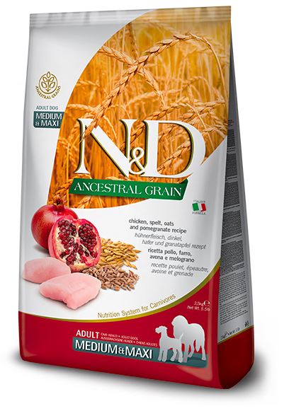 N&D Ancestral Grain Kip & Granaatappel is een volledig voer voor volwassen honden. Het voer bevat de oergranen spelt en haver, die zorgen voor een geleidelijke energieafgifte, en heeft daarbij een hoog eiwitgehalte, waarvan maar liefst 90% van de eiwitten van dierlijke oorsprong zijn.