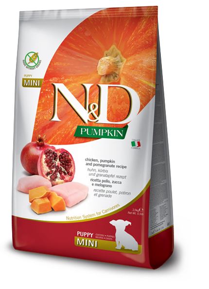 N&D Pumpkin Kip & Granaatappel Puppy is een volledig voer voor puppy's vanaf 8 weken tot 12 (kleine honden) tot 16 (grote honden) maanden en is ook geschikt voor drachtige en zogende teven. Het voer is graanvrij en heeft een hoog eiwitgehalte, waarvan maar liefst 96% van de eiwitten van dierlijke oorsprong zijn. Pompoen is rijk aan bètacaroteen, antioxidanten en oplosbare vezels. Dankzij deze eigenschappen draagt pompoen bij aan een gezonde spijsvertering en ondersteunt het zowel het immuunsysteem als het cardiovasculaire systeem.