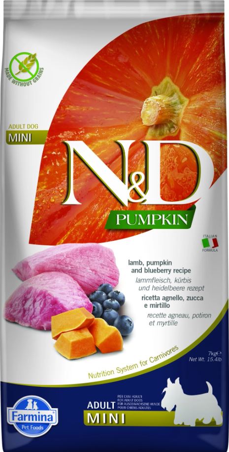 N&D Pumpkin Lam & Blauwe Bes is een volledig voer voor volwassen honden. Het voer is graanvrij en heeft een hoog eiwitgehalte, waarvan maar liefst 96% van de eiwitten van dierlijke oorsprong zijn. Pompoen is rijk aan bètacaroteen, antioxidanten en oplosbare vezels. Dankzij deze eigenschappen draagt pompoen bij aan een gezonde spijsvertering en ondersteunt het zowel het immuunsysteem als het cardiovasculaire systeem.