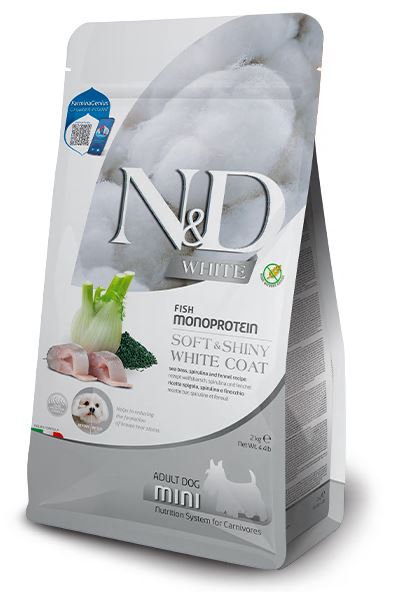 N&D White is een volledig voer voor volwassen witte honden. Het gaat traanstrepen en verkleuring van de witte vacht tegen. Het voer is graanvrij en maar liefst 96% van de eiwitten zijn van dierlijke oorsprong.