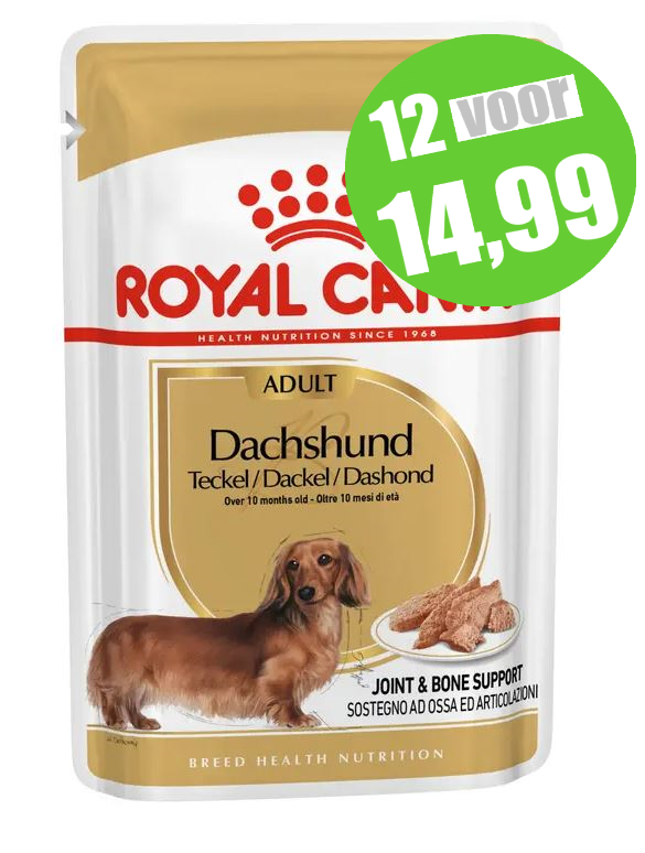 De teckel is een vriendelijk, intelligent en trouw ras dat algemeen bekend staat als de ideale familiehond. Volwassen teckels hebben een voeding nodig die alle voedingsstoffen aanvoert om te voldoen aan hun hoge energiebehoeften, om een gezonde activiteitsgraad te helpen ondersteunen. Royal Canin Dachshund in Loaf (paté in saus) is geschikt voor teckels van meer dan 10 maanden en is speciaal samengesteld om te voldoen aan de voedingsbehoeften van jouw volwassen hond. Royal Canin Dachshund in Loaf is ontwikkeld om bij te dragen aan het behoud van de spiertonus en spierspanning van je teckel. De optimale samenstelling van Royal Canin Dachshund in Loaf helpt ook om de gezondheid van de gewrichten en botten te ondersteunen. Royal Canin Dachshund in Loaf heeft een speciaal aangepaste textuur om de smakelijkheid te vergroten. Daardoor helpt deze specifieke formule om de eetlust van je hond te stillen, zelfs als hij een kieskeurige eter is! Om aan de individuele voorkeuren van elke hond te beantwoorden, is Royal Canin Dachshund in Loaf ook verkrijgbaar als smakelijke droogvoeding met een knapperige brok. Verkies je een combinatie van droog- en natvoeding? Volg dan bij het mengen gewoon de voedingsrichtlijnen op onze verpakking om je hond de optimale hoeveelheid van beide te geven.