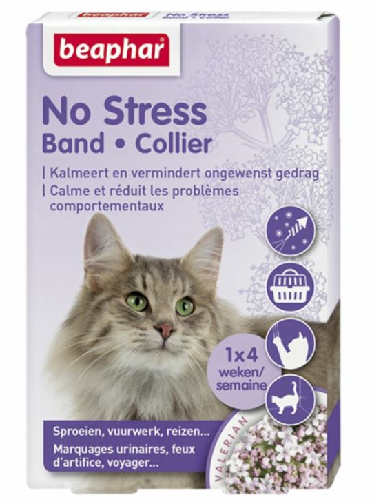 De No Stress band vermindert stress en houdt katten kalm door het rustgevende effect van valeriaan en lavendel gedurende 3-4 weken. Te gebruiken bij overmatig miauwen of sproeien, bij verlatingsangst, bij pension- en dierenartsbezoek, bij reizen of verhuizen, bij onweer, bij vuurwerk, bij vernieling of ongewenst territoriumgedrag en bij moeilijkheden met samenleven. Geschikt voor alle kattenrassen en leeftijden. Werkzaam na ca. 1 uur.