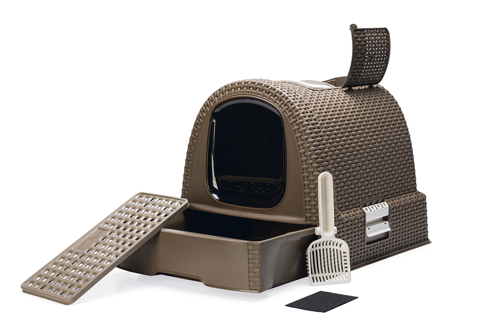 Deze Curver Kattenbak bestaat voor 95% uit gerecycled materiaal (huishoudelijk plastic afval en oude visnetten op de bodem van de zee (ocean waste)). De overige 5% zijn nieuwe grondstoffen. De hele kattenbak is op zijn beurt ook weer 100% recyclebaar. De kattenbak heeft een modieuze uitstraling doordat het een motief heeft van gevlochten rattan. De lade aan de voorkant heeft een plateau met gaatjes, waardoor de kat een groot deel van het kattenbakgrit achterlaat in de bak alvorens de kattenbak te verlaten. Door de uitschuifbare lade kan je in een oogopslag zien of de kattenbak aan verschoning toe is. Aan de bovenkant van de kattenbak bevindt zich een klepje waar de kattenbakschep opgeborgen kan worden. De Curver Kattenbak is zo mooi dat je nauwelijks ziet dat het een kattentoilet is.