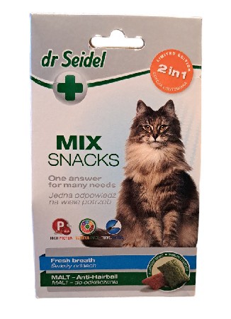 Ontdek een wereld van smaak en gezondheid voor jouw kat met onze Dr. Seidel kattensnacks Mix frisse adem en haarbal. Deze mix is verrijkt met heilzame stoffen in hoeveelheden die overeenkomen met die van voedingssupplementen, waaronder: