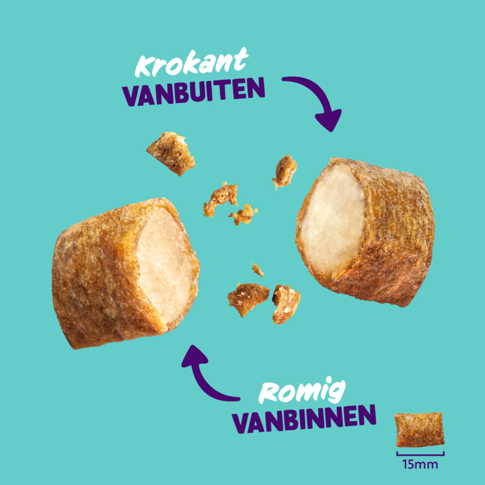 Een zachte, rrromige vulling in een krokant jasje. Wedden dat je kat deze verrassende textuur onweerstaanbaar vindt? Boordevol lekker verse kip en natuurlijke ingrediënten - zonder granen of toegevoegde suiker. En met minder dan 2 kcal per snack mag je je kat gerust nog een keer belonen, en nog eens en nog eens.