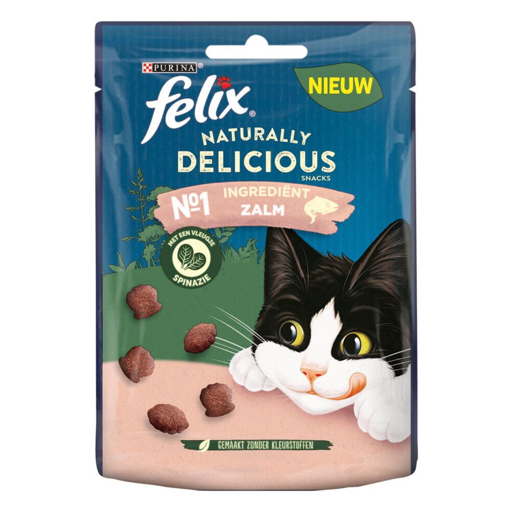 Felix Naturally Delicious snacks zijn gemaakt met hoogwaardige ingrediënten en zonder kleurstoffen. Deze gezonde snacks met een hoge kwaliteit zalm als hoofdingrediënt en een speciaal natuurlijk ingrediënt, spinazie, zijn een geweldige gelegenheid om samen een liefdevol moment te delen! Kijk uit naar het enthousiasme en de sprankelende ogen van jouw kat terwijl hij geniet van deze onweerstaanbare en voedzame lekkernijen.