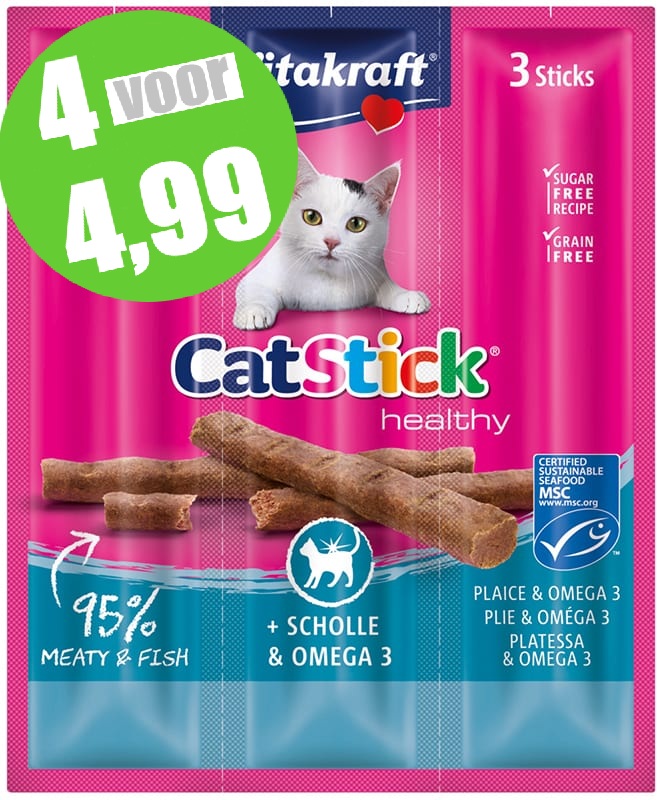 De populaire Cat Stick mini met schol en omega 3 overtuigt met topkwaliteit, een extra hoog vis-/vleesgehalte, een suikervrije receptuur, een unieke, onweerstaanbare smaak en bevat geen kleurstoffen en smaakversterkers. Deze Cat Stick mini heeft een ondersteunende werking op de huid en vacht van de kat. De Cat Stick mini heeft handige afbreekpunten waardoor de stick in kleine stukjes kan worden gevoerd. Ze zijn per drie stuks, afzonderlijk in folie verpakt om de versheid van de Cat Stick mini te kunnen garanderen.