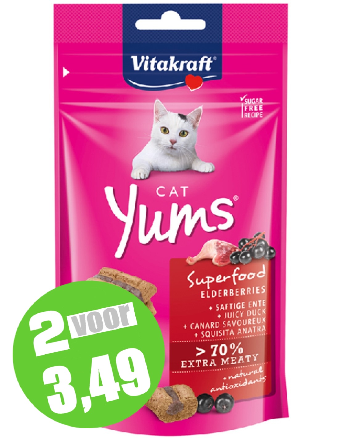Vitakraft Cat Yums Superfood met vlierbessen zijn sappige kattensnacks met eend en vlierbessen. Vlierbessen zijn van nature rijk aan antioxidanten. Antioxidanten helpen met het beschermen van de cellen van de kat. Cat Yums zijn bereid met de beste ingrediënten en volgens een suikervrije receptuur. Elke snack is gevuld met een zachte, zichtbare vulling en extra vlees. De snacks zijn met zorg in de oven bereid.