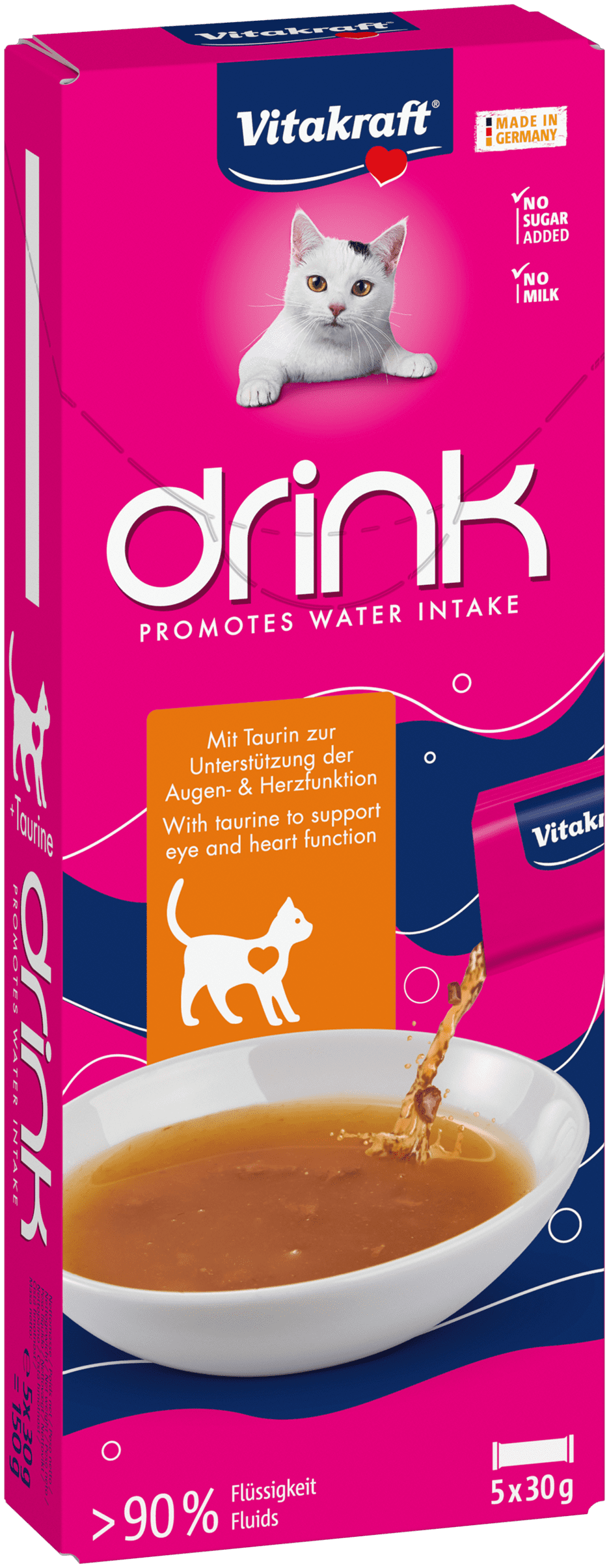 Is jouw kat een slechte drinker en wil jij zijn vochtgehalte een boost geven? Verwen je fijnproever dan met de Vitakraft Drink. Een heerlijke drinksnack met onweerstaanbare stukjes kip die jouw gezinslid al spinnend naar binnen slurpt. De Vitakraft Drink is dus verwennen én verzorgen in één! Drinken ging nog nooit zo makkelijk en was nog nooit zo lekker. Bovendien bevat dit drankje taurine waardoor onder andere het hart, netvlies en gezichtsvermogen van je kat ondersteunt worden. Een echte power drink dus!