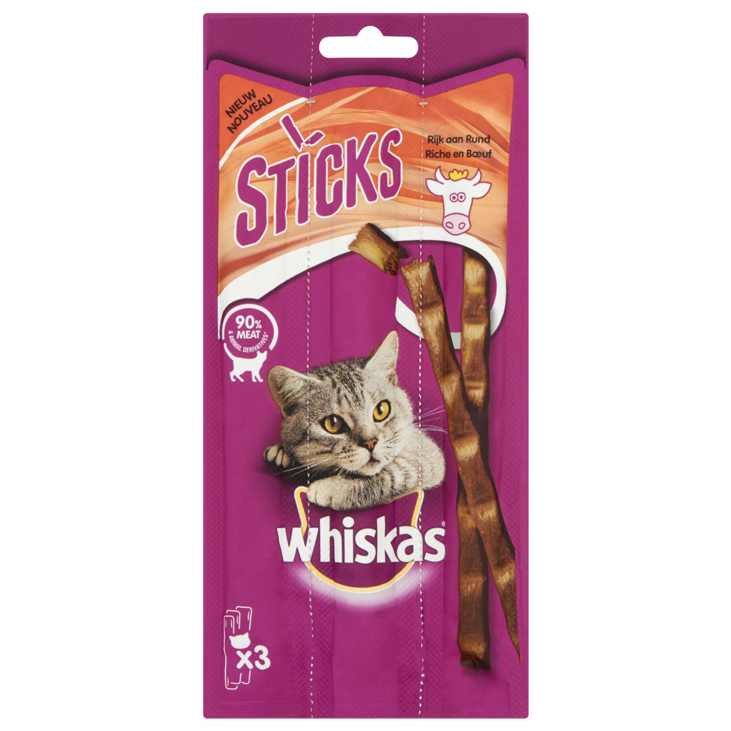 Whiskas Sticks, een heerlijke snack met vlees voor uw kat. Op basis van 80% vlees in elke stick, het ideale tussendoortje voor elk moment.