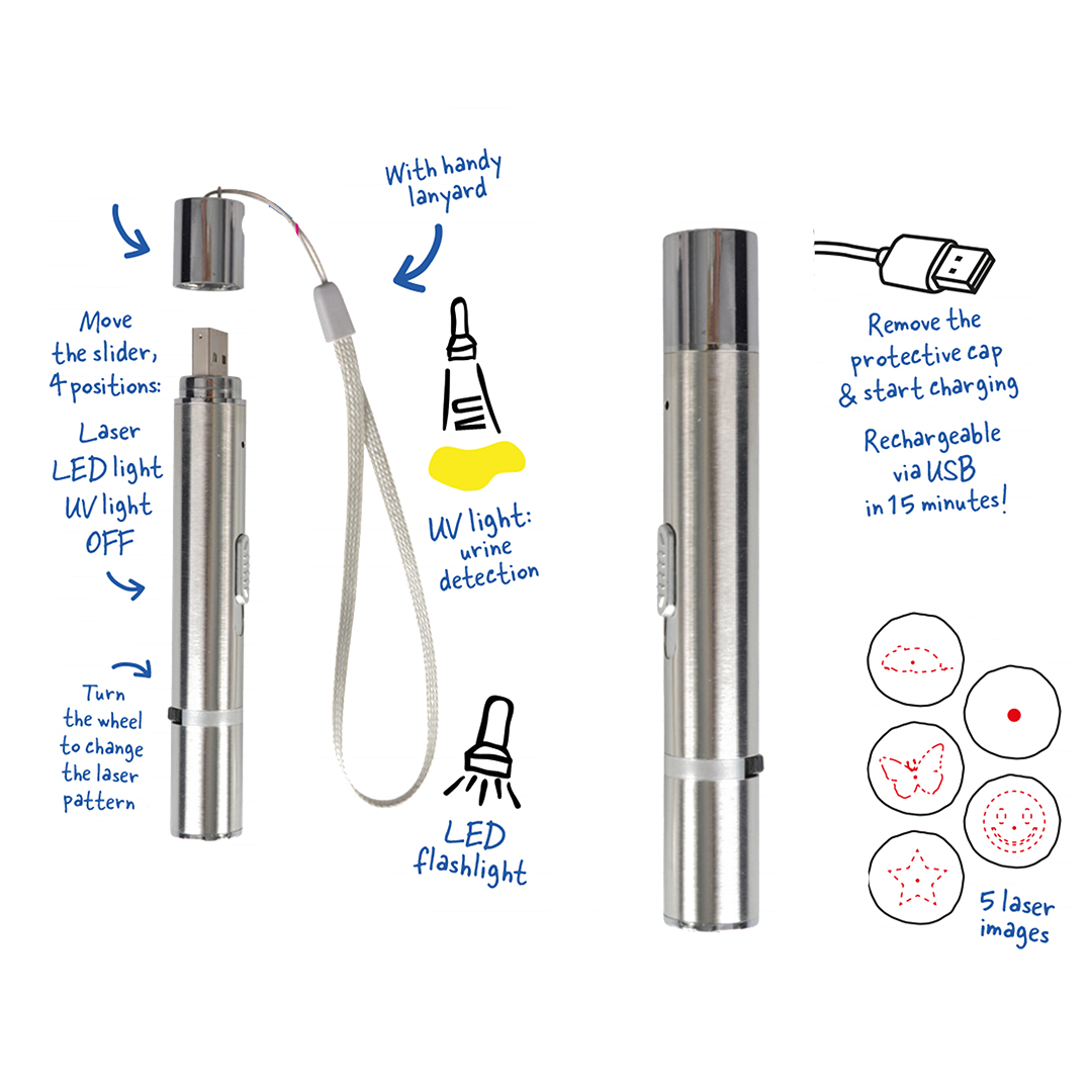 Met de LED laser pointer van duvoplus kan je je kat uren lang van speelplezier voorzien. Je kat zal tijdens het jagen op het rode puntje veel plezier beleven. Je kat kan op 5 verschillende afbeeldingen jagen. De pointer is ook voorzien van LED licht en UV licht en het heeft een lanyard. Hij is na 15minuten opgeladen via USB. Met dit speeltje kan je je kat extra stimuleren om samen met jou te spelen. Katten hebben vaak de neiging om te dik te worden, een actief speeltje houdt katten fit en gezond.