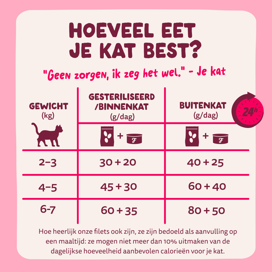 Het perfecte moment om je kat deze verrukkelijke filets te geven? Elk moment. De 100% natuurlijke sappige kip met garnalen in een zalige bouillon doet het uitstekend als hartige amuse-bouche vóór het hoofdgerecht. Natuurlijk kun je onze graanvrije filets ook geven als ultieme beloning na de maaltijd. En heb je het soort kat dat variatie waardeert? Dan is deze filets van zachte kipreepjes als bijgerecht krijgen een droom die waar wordt. Kortom, onze filets zijn een allround win-win-win. Of win-win-win-win? We zijn de tel een beetje kwijt.