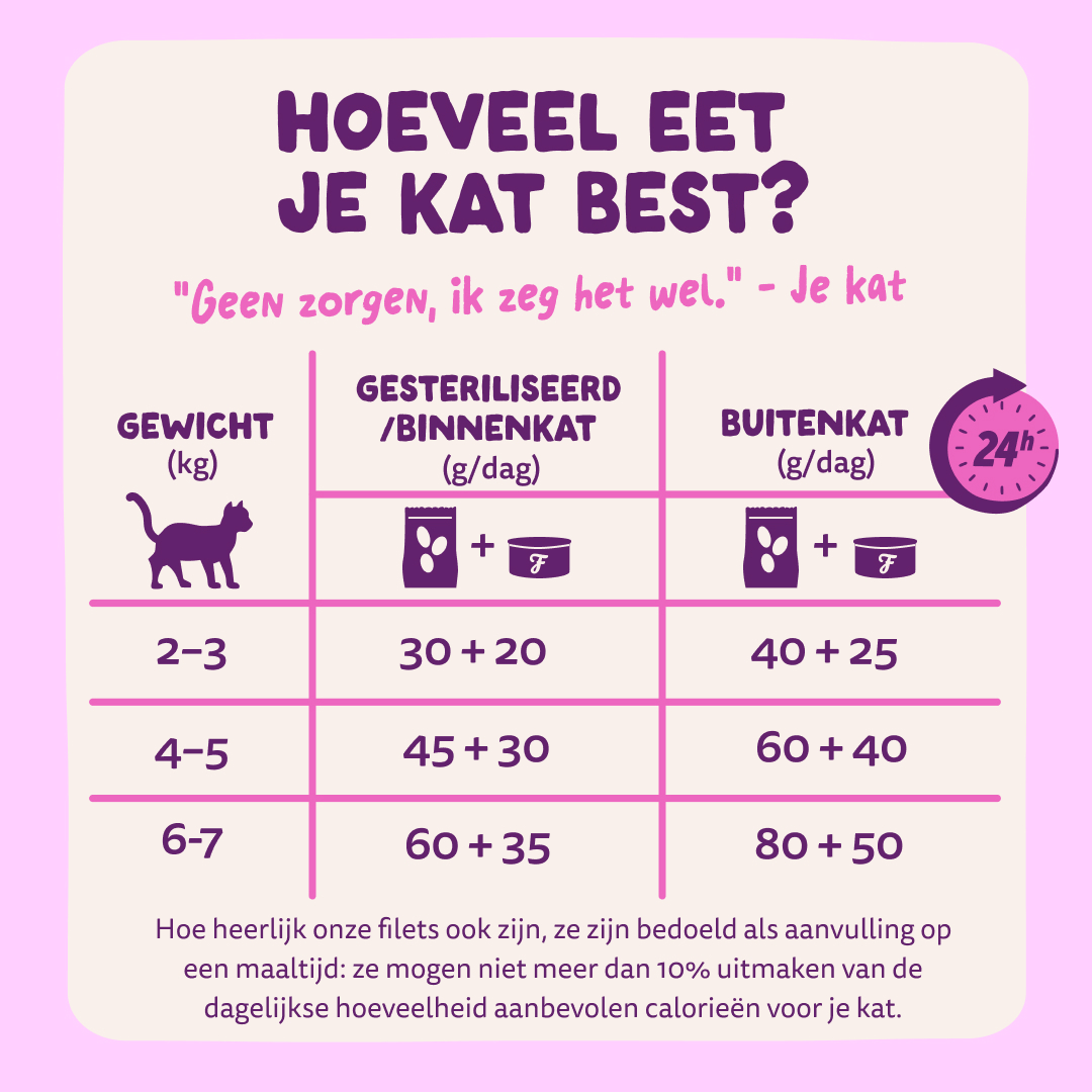 Het perfecte moment om je kat deze verrukkelijke filets te geven? Elk moment. De 100% natuurlijke MSC-gecertificeerde zalm en kip in een zalige bouillon doet het uitstekend als hartige amuse-bouche vóór het hoofdgerecht. Natuurlijk kun je onze graanvrije filets ook geven als ultieme beloning na de maaltijd. En heb je het soort kat dat variatie waardeert? Dan is deze heerlijke zalm en sappige kip als bijgerecht krijgen een droom die waar wordt. Kortom, onze filets zijn een allround win-win-win. Of win-win-win-win? We zijn de tel een beetje kwijt.