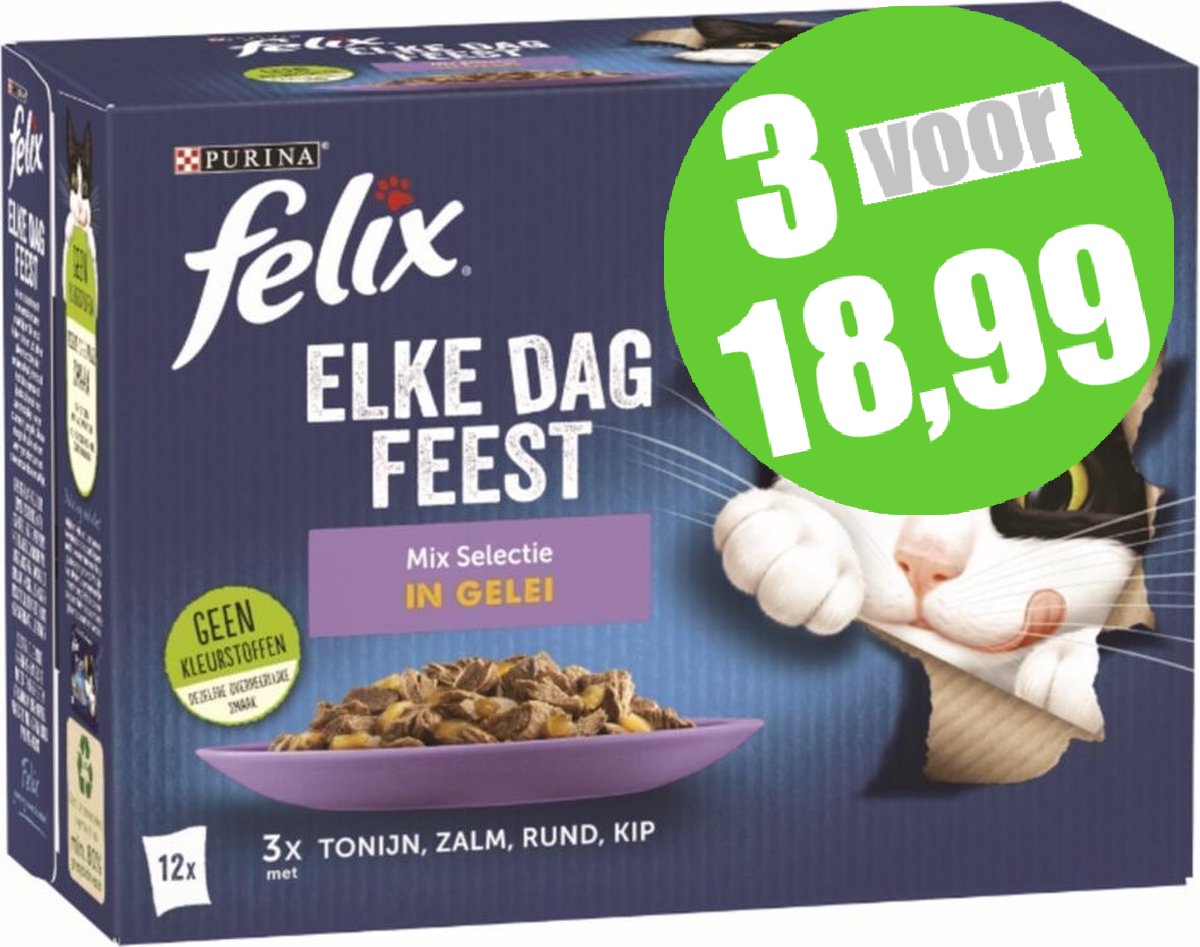 Felix Elke Dag Feest is een assortiment onweerstaanbare maaltijden die er zó lekker uitzien, zó lekker ruiken en zó lekker smaken alsof je het zelf hebt klaargemaakt! Speciaal bereid met zachte stukjes in een overheerlijke gelei. Jouw deugniet zal elke keer weer genieten van een onweerstaanbare maaltijd. Deze heerlijke maaltijden vormen ook een bron van essentiële omega 6-vetzuren met de juiste combinatie van uitgebalanceerde vitaminen die jouw kat energie zullen geven en klaar zullen maken om nog meer kattenkwaad uit te halen. Ze zitten vol gezonde ingrediënten om 100% te voldoen aan de behoeften van jouw kat indien gevoed volgens de voedingsrichtlijnen op de verpakking. Felix - gewoonweg onweerstaanbaar!