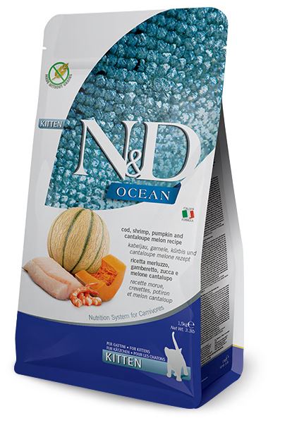 N&D Ocean Kabeljauw, Garnaal, Pompoen & Meloen Kitten is een volledig voer voor kittens vanaf 8 weken tot 12 tot 16 (grote katten) maanden en is ook geschikt voor drachtige of zogende poezen. Het voer is graanvrij en heeft een hoog eiwitgehalte, waarvan maar liefst 96% van de eiwitten van dierlijke oorsprong zijn. Dankzij de kabeljauw en garnaal bevat het voer extra omega-3-vetzuren, die een ontstekingsremmende werking hebben en bijdragen aan een gezonde huid en vacht. Pompoen is rijk aan bètacaroteen, antioxidanten en oplosbare vezels. Dankzij deze eigenschappen draagt pompoen bij aan een gezonde spijsvertering en ondersteunt het zowel het immuunsysteem als het cardiovasculaire systeem.