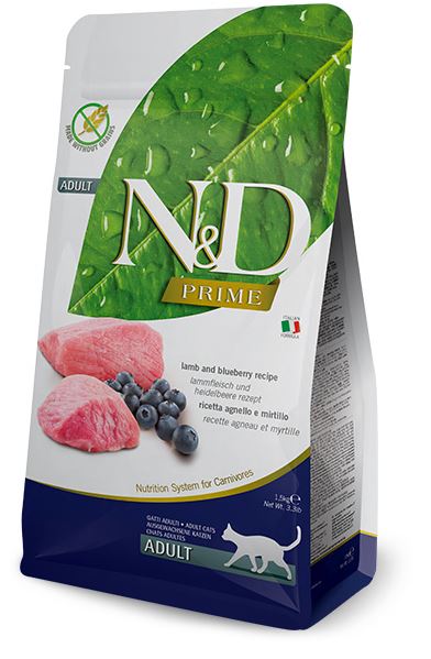 N&D Prime Lam & Blauwe Bes is een volledig voer voor volwassen katten. Dit hoogwaardige graanvrije voer heeft een hoge energiedichtheid en een hoog eiwitgehalte, waarvan maar liefst 98% van de eiwitten van dierlijke oorsprong zijn. Het voer is afgestemd op de natuurlijke carnivore behoeften van katten en bevat daarom extra veel vlees. Het bestaat voor 70% uit dierlijke ingrediënten en voor 30% uit zorgvuldig geselecteerde groenten, fruit, vitamines en mineralen, wat zorgt voor een perfect uitgebalanceerde maaltijd.