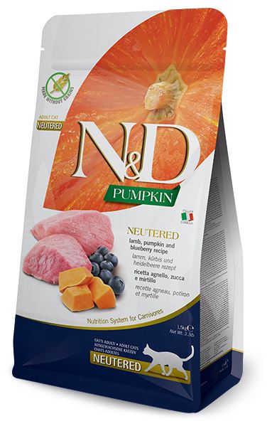 N&D Pumpkin Lam & Blauwe Bes Gecastreerd is een volledig voer voor volwassen gecastreerde en gesteriliseerde katten. Het voer is graanvrij en heeft een lagere energiedichtheid en een hoog eiwitgehalte om een gezond lichaamsgewicht te behouden, met maar liefst 96% eiwitten van dierlijke oorsprong. Pompoen is rijk aan bètacaroteen, antioxidanten en oplosbare vezels. Dankzij deze eigenschappen draagt pompoen bij aan een gezonde spijsvertering en ondersteunt het zowel het immuunsysteem als het cardiovasculaire systeem.