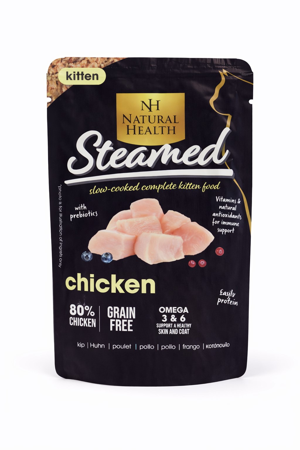 Natural Health Cat Steamed is een hoogwaardige, graanvrije natvoeding voor volwassen katten. Elke variant is bereid met zorgvuldig gestoomde ingrediënten van natuurlijke oorsprong, zoals vlees, vis, organen en bouillon. Dankzij het stoomproces blijven smaak, geur en voedingsstoffen behouden, wat zorgt voor een heerlijke en voedzame maaltijd. De toevoeging van gezonde oliën, kruiden en bessen ondersteunt de algehele gezondheid en vitaliteit van je kat.