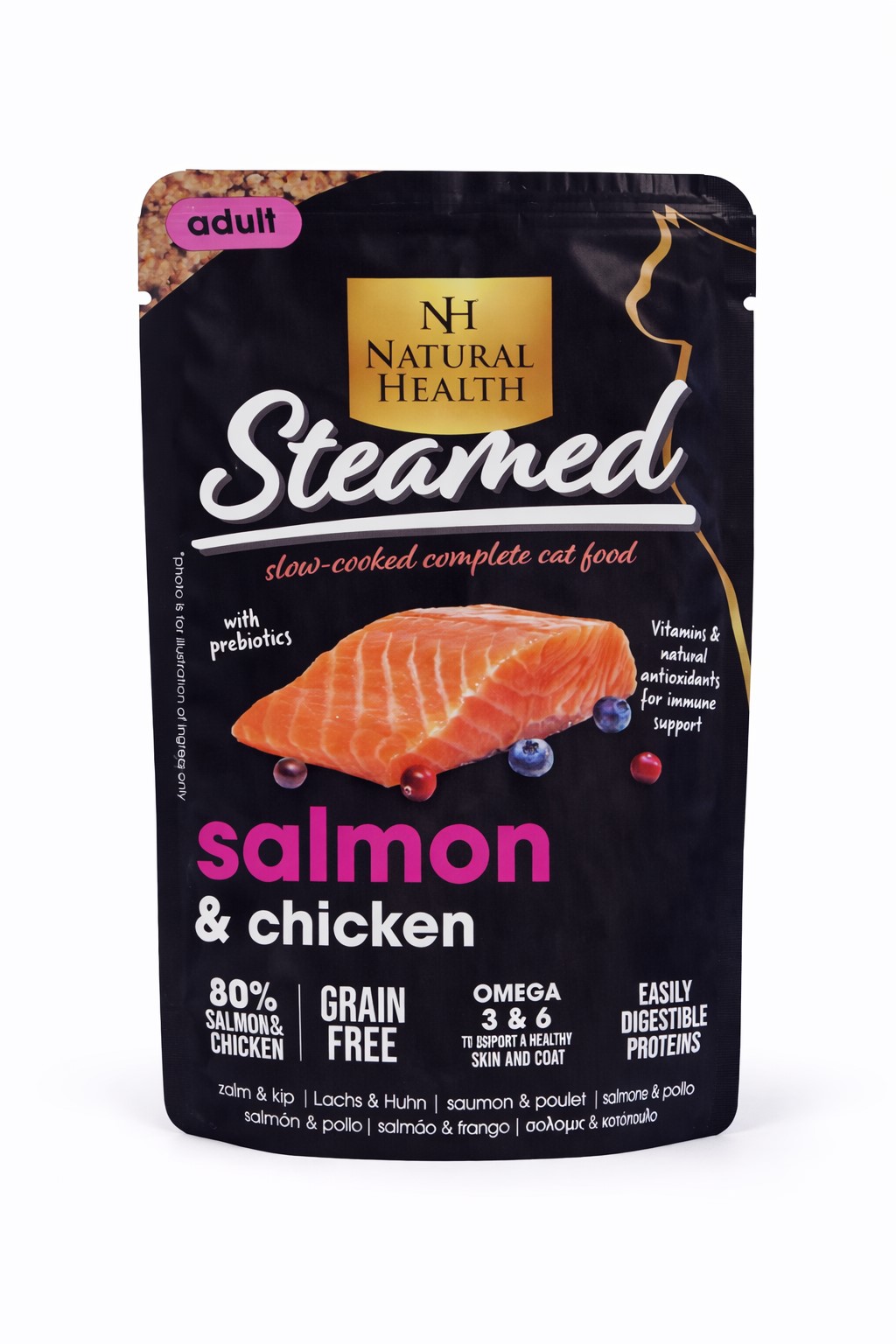 Natural Health Cat Steamed is een hoogwaardige, graanvrije natvoeding voor volwassen katten. Elke variant is bereid met zorgvuldig gestoomde ingrediënten van natuurlijke oorsprong, zoals vlees, vis, organen en bouillon. Dankzij het stoomproces blijven smaak, geur en voedingsstoffen behouden, wat zorgt voor een heerlijke en voedzame maaltijd. De toevoeging van gezonde oliën, kruiden en bessen ondersteunt de algehele gezondheid en vitaliteit van je kat.