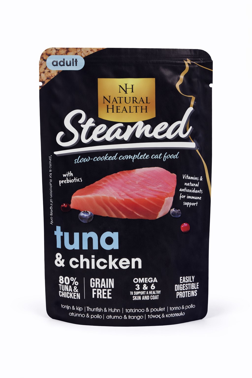 Verwen je kat met de verrukkelijke en gezonde Steamed Tuna van Natural Health. Deze smakelijke maaltijd bestaat uit 100% gestoomde tonijn, zorgvuldig bereid om de natuurlijke smaken en voedingsstoffen te behouden. Het product is vrij van kunstmatige toevoegingen en bevat geen granen, waardoor het ideaal is voor katten met een gevoelige spijsvertering of die gevoelig zijn voor graan. Tonijn is een uitstekende bron van hoogwaardige eiwitten en essentiële omega-3 vetzuren die helpen bij het ondersteunen van een gezonde huid, een glanzende vacht en een sterk immuunsysteem. De 85 gram portie is perfect als smakelijke snack of als aanvullend voer voor je kat.